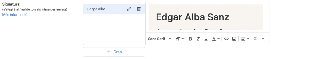 On possa “Per als correus electrònics nous, utilitza” seleccionem la firma que acabem de crear en el menú desplegable, en aquest cas “Edgar Alba Sanz”