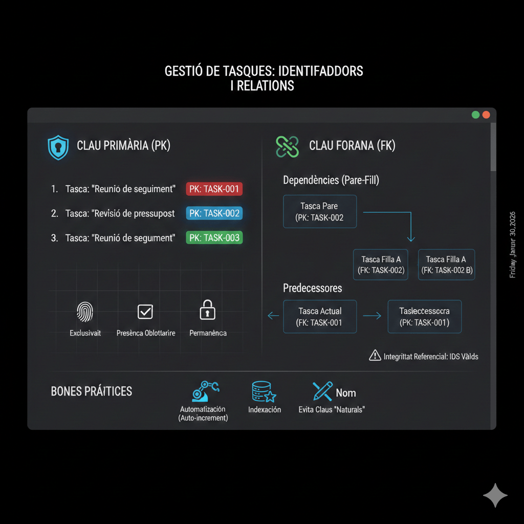 La Clau Primària actua com el “DNI” de cada tasca. És un codi únic que permet al sistema diferenciar elements, fins i tot si tenen el mateix nom (com ara dues tasques anomenades “Reunió de seguiment”).
