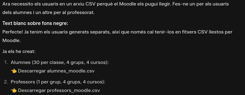 «Necessito que em preparis els usuaris en un fitxer CSV compatible amb Moodle. Si us plau, genera’m dos arxius diferents: