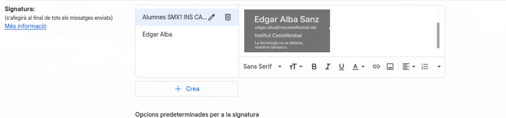 Per donar-li un toc més “professional”, podem utilitzar una plantilla de la plataforma Canva, personalitzar-la i definir-la com a signatura.