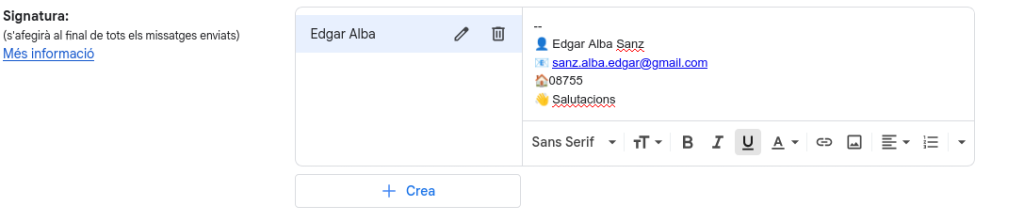 I escrivim el text que volem que aparegui com a firma. Un cop acabat, deses els canvis.