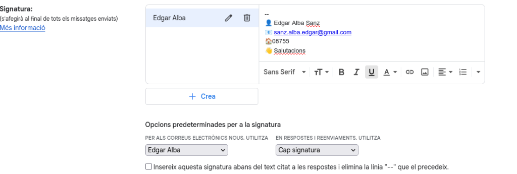 Per configurar la signatura automàtica em de fixar-nos en l’apartat on posa “Opcions predeterminades per a la signatura”: