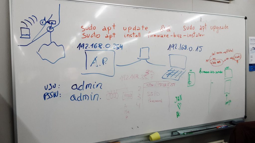 A la taula es mostren ordres per tal de fer funcionar el Wi-Fi en un PC que utilitza Linux, específicament les comandes sudo apt update i doble e comercial, sudo apt upgrade per posar al dia el sistema operatiu, i sudo apt install firmware-b43-installer per baixar el programari bàsic requerit per als aparells Broadcom; igualment s’hi veuen dibuixos d’un sistema de connexió amb un router connectat, diferents aparells enllaçats, adreces com 192.168.0.254 i 192.168.0.15 per entrar a gestionar l’encaminador, i apuntaments sobre el nom i el codi d’accés originals (“admin/admin”), a més de records sobre com definir el nom i la clau d’accés de la xarxa sense fil, configurant tot això una guia visual sobre com preparar l’equip, col·locar els drivers i ajustar la xarxa sense fils.