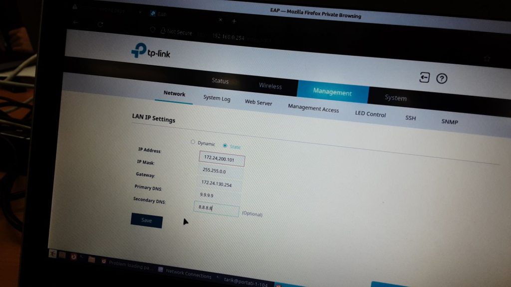 La imatge número dos ensenya la pantalla de gestió d’un repetidor TP-Link, més precisament la secció de Configuració IP de la xarxa local, on s’ha assignat una adreça IP fixa juntament amb la màscara, la porta d’enllaç i els servidors DNS. Aquesta disposició facilita controlar l’aparell dins de la xarxa del DESAFIAMENT i confirmar que tot va bé. Aquesta captura és un tros de la documentació del desenvolupament, on es veuen bé les opcions triades i s’assegura que les dades es puguin tornar a fer servir més endavant en altres ajustos o guies tècniques.