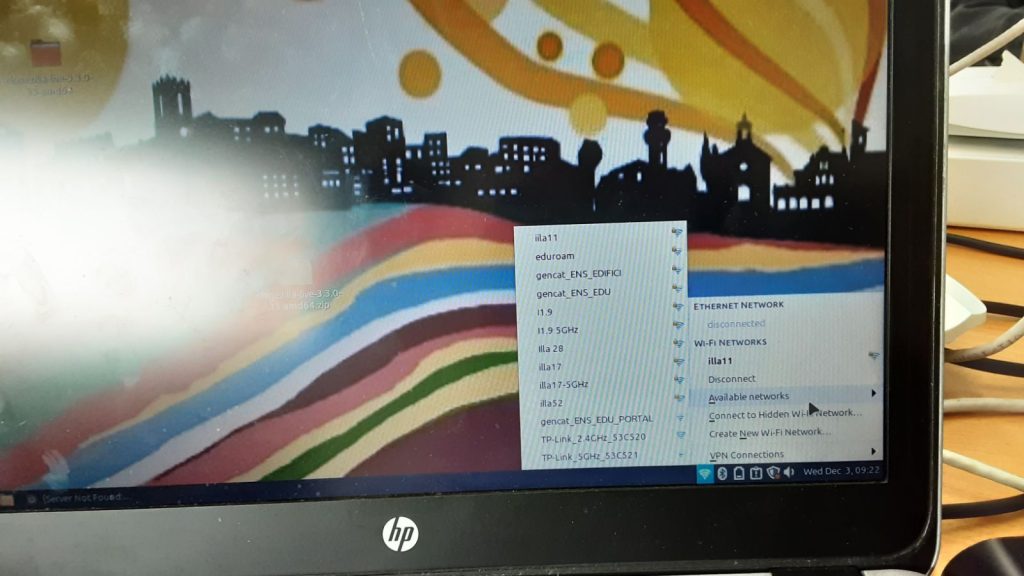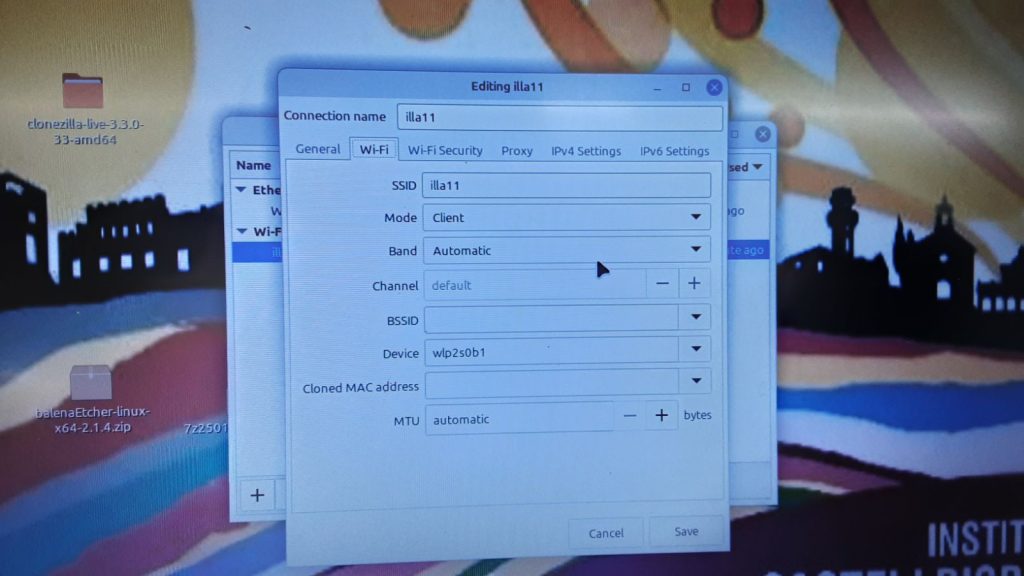 Aquí es veu la pantalla per modificar la connexió sense fils del programari, on s’aprecia el nom de xarxa “illa11”, l’opció triada com a Client i la connexió inalàmbrica escollida. Aquesta vista s’inclou en els passos per preparar els equips del REPTE, garantint que puguin enllaçar-se bé a les diverses xarxes que hi hagi. A més, es demostra que el Wi-Fi funciona i que la configuració està a punt per agafar les dades automàticament amb DHCP, seguint així les normes de configuració flexible marcades.